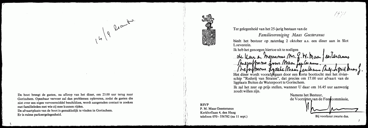 Uitnodiging diner voor het 25-jarig bestaan Familievereniging MG (1971) Afdrukken | E-mailadres Uitnodiging diner voor het 25-jarig bestaan Familievereniging MG (1971)