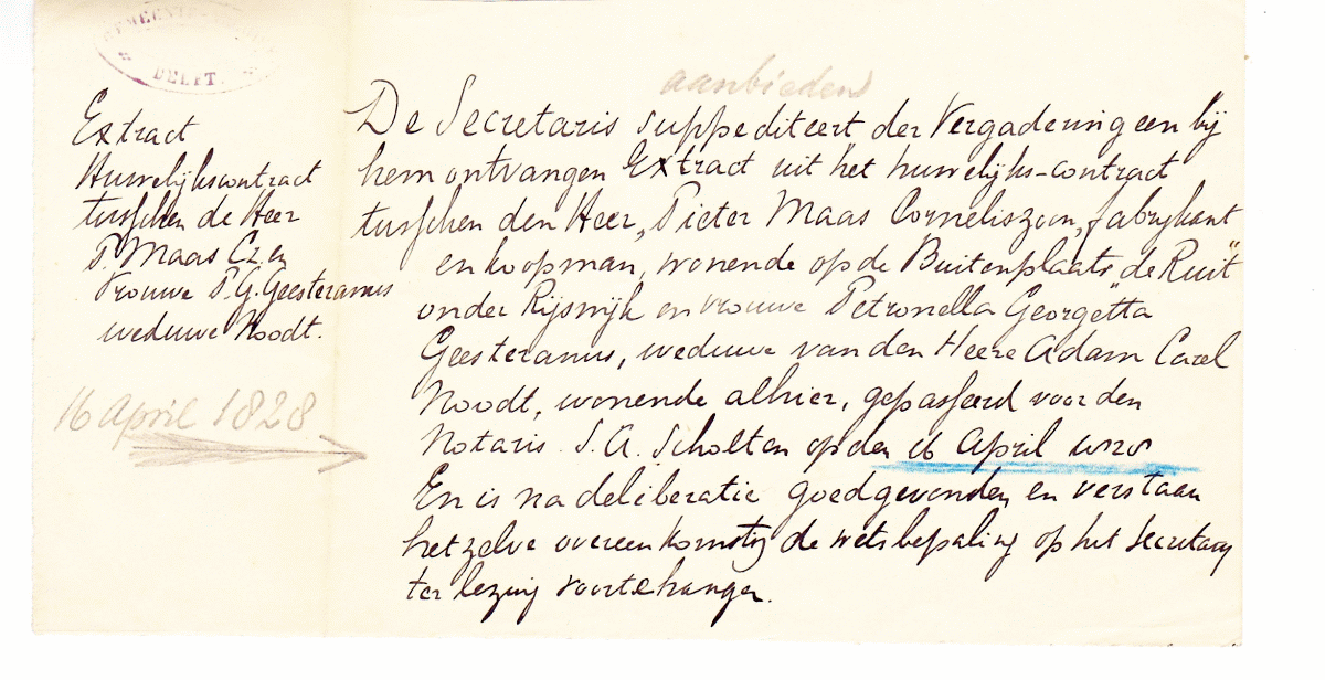 Dit extract huwelijkscontract tussen Pieter Cornelisz Maas en Petronella Georgetta Geesteranus werd opgesteld op 16 april 1828.