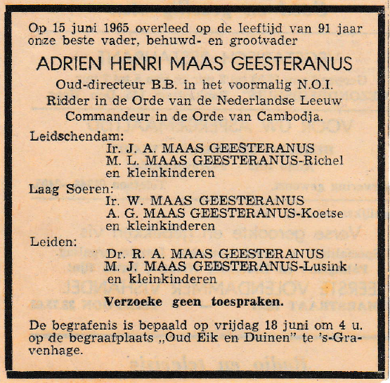 Overlijdensannonce Adrien Henri MG (1873-1965) Afdrukken | E-mailadres Overlijdensannonce van Adrien Henri MG (1873-1965).