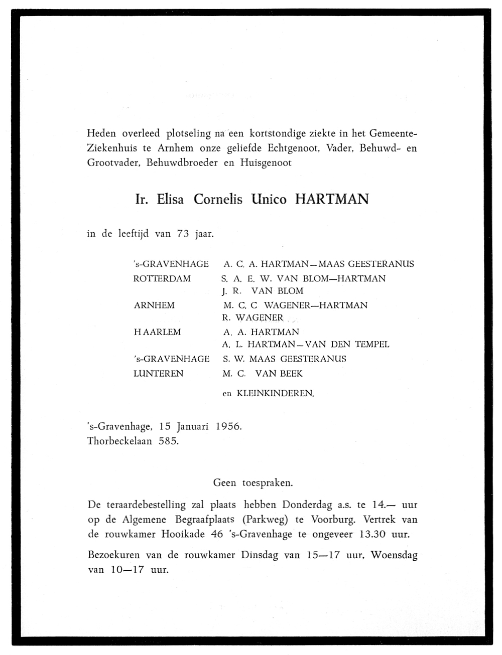 Elisa Cornelis Unico Hartman (1882-1956) - overlijdensbericht Afdrukken Elisa Cornelis Unico Hartman (1882-1956) was getrouwd met Anna Catharina Adriana MG (1884-1976).