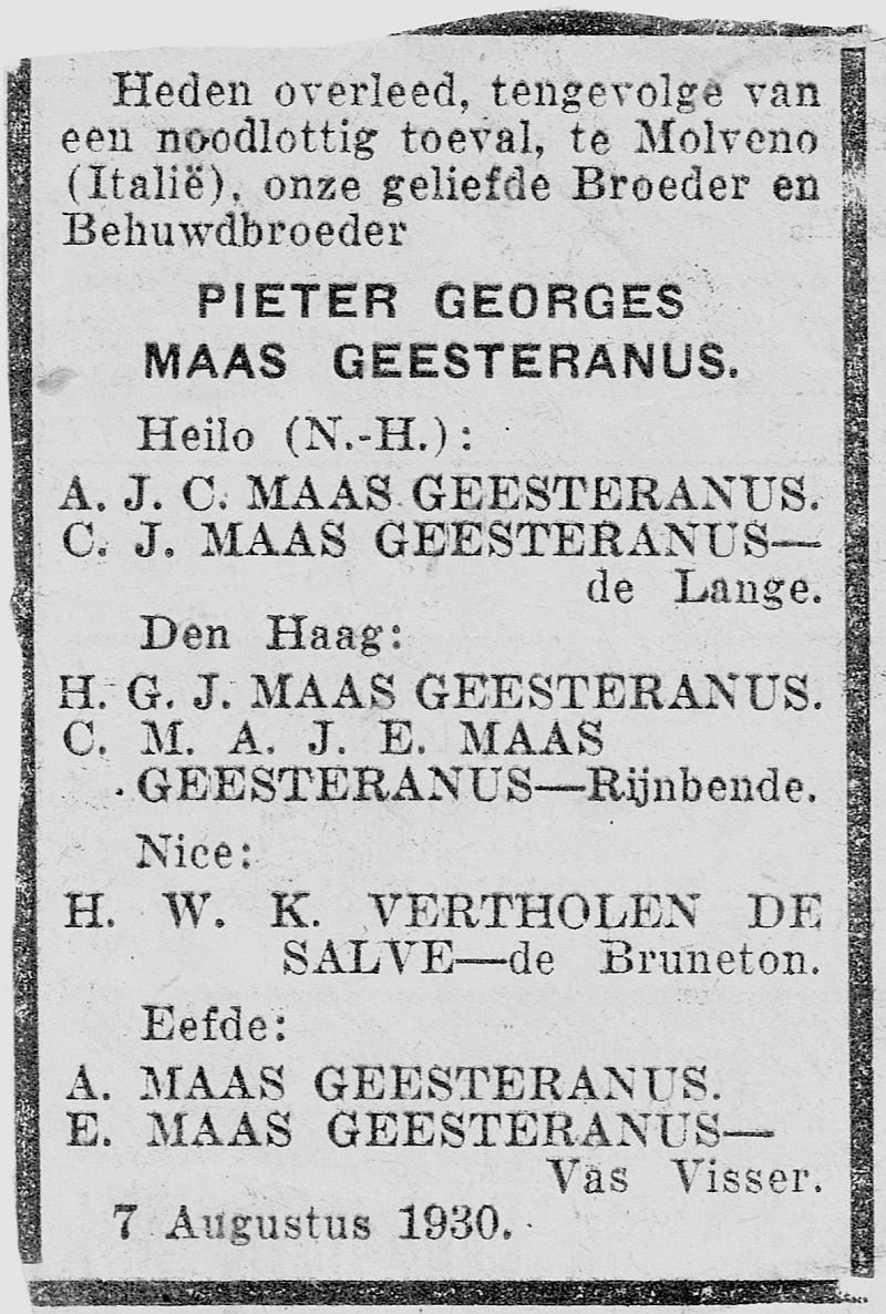 Pieter George MG (1875-1930) werd op 28 mei 1875 geboren als zesde kind van Hendrik Gerard Johan MG (1837-1894) en Maria Johanna Hoogendijk (1838-1891).
