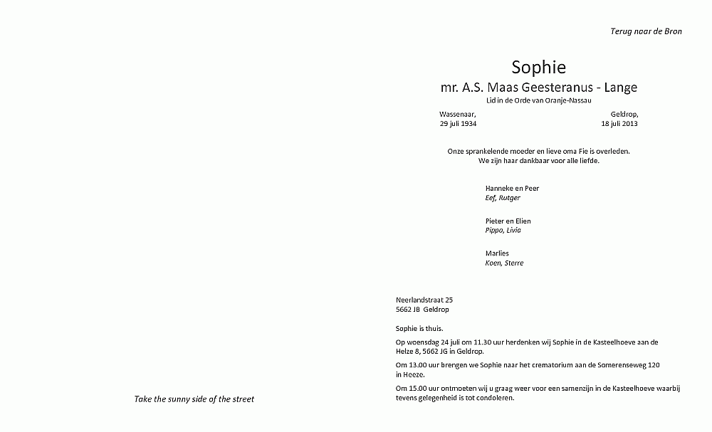 Ashraff Sophie Lange (1934-2013) - overlijdenskaart Afdrukken | E-mailadres Ashraff Sophie Lange (1934-2013) was getrouwd met Hendrik Philip MG (1931-1993).