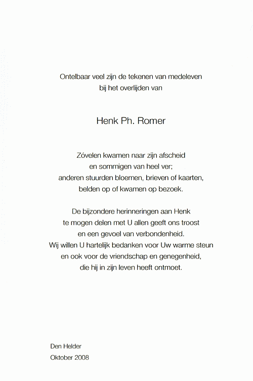 Hendrik Phoebus Romer (1926-2008) - bedankkaartje na overlijden Afdrukken | E-mailadres Hendrik Phoebus Romer (1926-2008) was getrouwd met Sigrid Emilie MG (1930-2012).